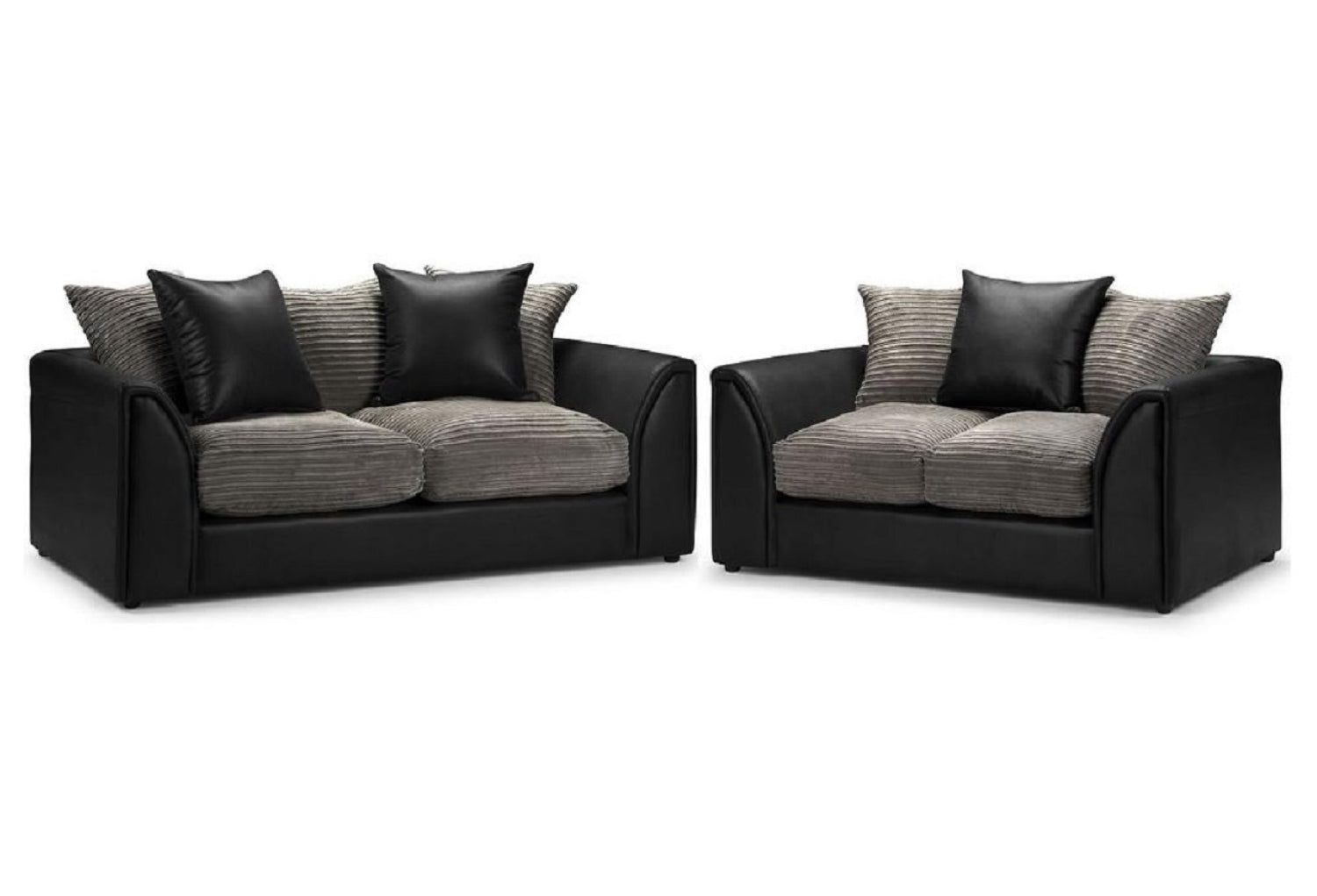 The contemporary Byron leather and fabric sofa with cushions features leather armrests and springs at the base to offer maximum comfort. This sofa is made using the best quality faux leather and fabric, giving you the best comfort from your sofa. Formal back cushions, Spring base for extra comfort, block foam seat cushions with a layer of fibre for comfort. Higher back for added comfort, faux leather frame and jumbo cord cushions. Key features include: