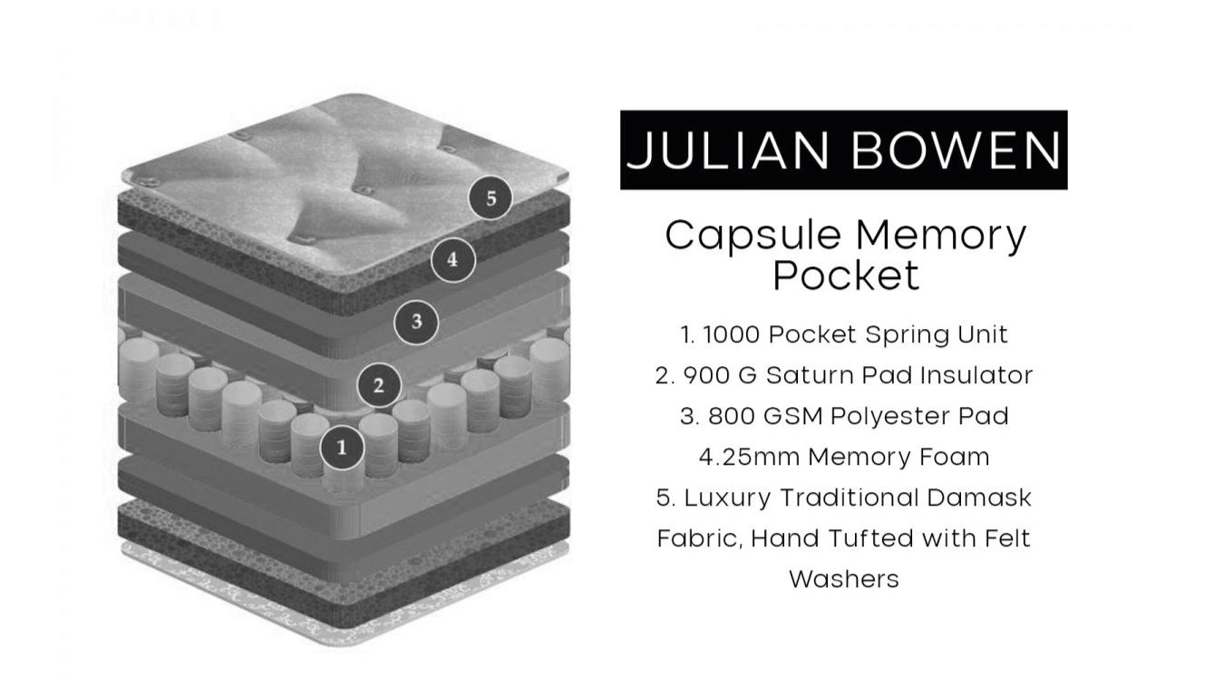The Capsule Memory Pocket Mattress offers supreme comfort, featuring a 1000 Pocket Spring unit topped with 25mm of Memory Foam, Finished in a luxury damask fabric, hand tufted with felt washers and air vents to increase air flow and breathability. Available in 135cm, 150cm and 180cm sizes, this mattress is part of the Capsule Mattress Collection.