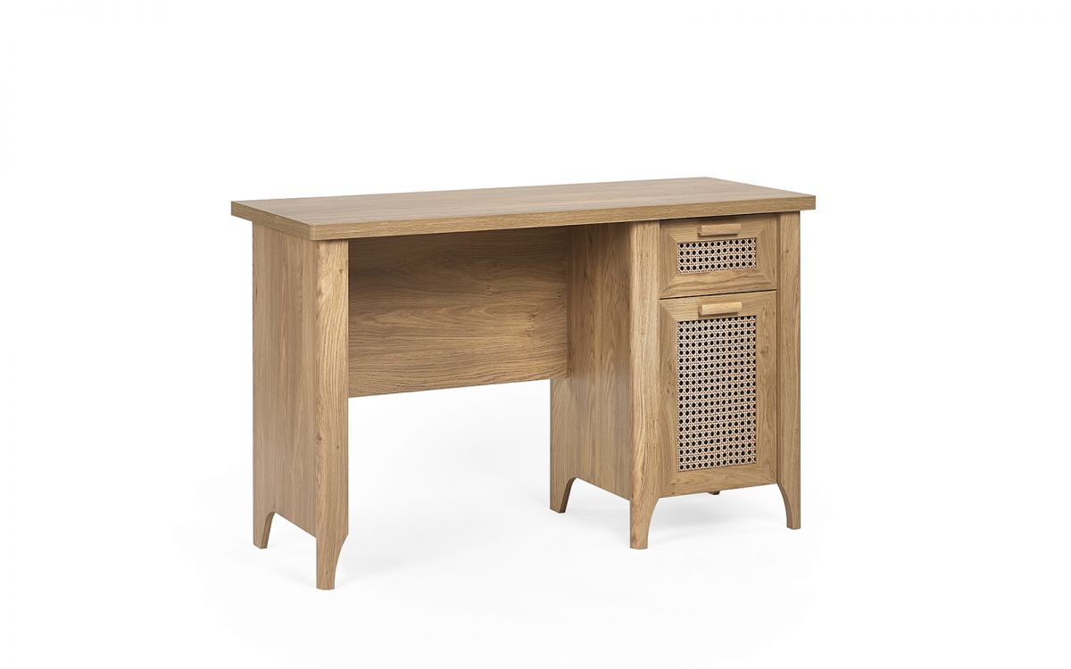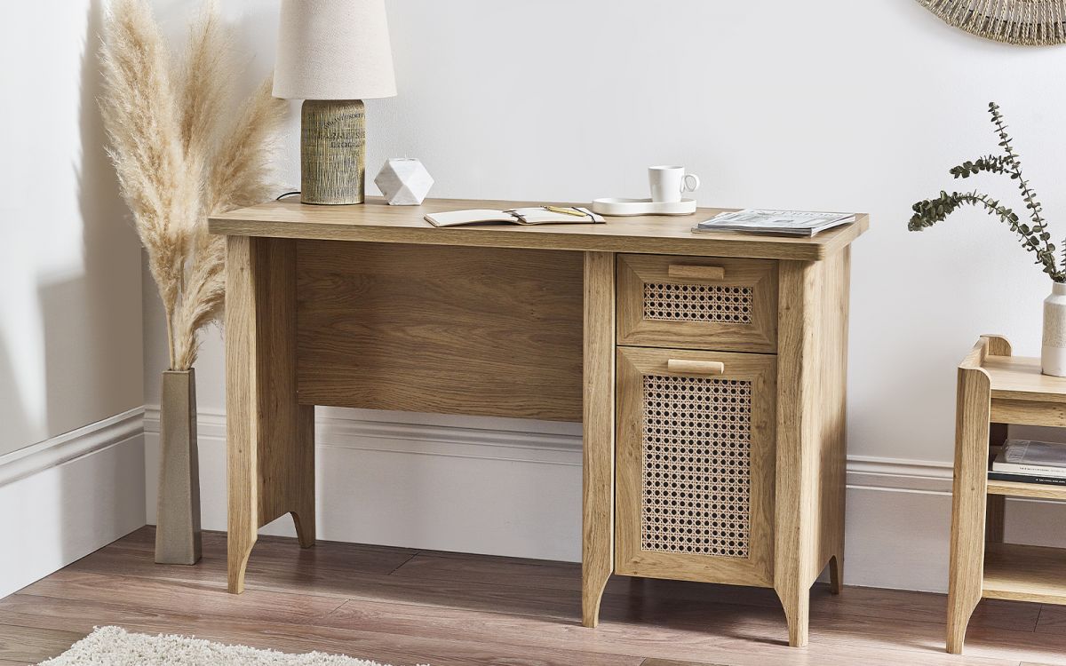 Showcasing a beautifully sleek design with a bohemian feel, the Sydney Desk offers exquisitely curved edging with gentle soft lines stunningly combined with a rattan effect front. Finished with a natural oak effect featuring one pull-out drawer and one cupboard providing the ideal storage space for stationary essentials. All around creating the perfect airy, warm feel within your home.